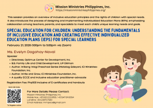 In the area of church ministry, MMP facilitated the seminar “Rekindle, Revisit, Revitalize Your Sunday School” at God’s Children Learning Center, General Trias, Cavite on August 30, 2026, after several postponements due to weather.